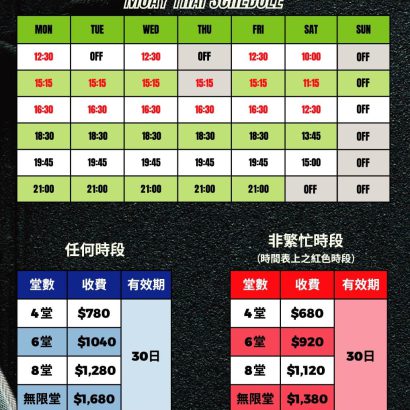 It covers a wide range of time slots from Monday to Sunday (except for the marked “OFF”), from afternoon to evening, to meet different scheduling needs. You can choose from 4, 6, 8, and unlimited classes, with a 30-day validity period. It helps you systematically learn Thai boxing skills, improve physical fitness and combat ability. Whether you are a beginner looking to get started or an advanced practitioner seeking to consolidate your techniques, you can find the right pace for your needs.